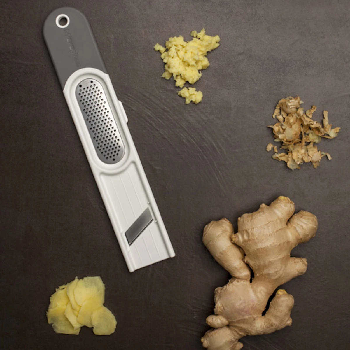 Mit der Microplane Ingwer Reibe 3-in-1 schält, schneidet und reibt Ihr Ingwer mit nur einem einzigen Werkzeug. Die feine, rasiermesserscharfe Edelstahlklinge sorgt für dünn gehobelte Ingwerscheiben. Hergestellt in den USA.