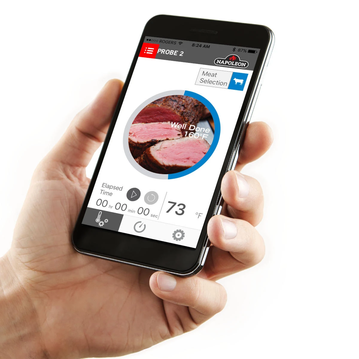 Das Grillthermometer könnt Ihr dank der magnetischen Halterung am Grill platzieren. Es besitzt eine Reichweite bis zu 50m. Ihr könnt das Napoleon Bluetooth Thermometer einfach mit eurem Android Smartphone oder iPhone verbinden und die Kerntemperatur ganz bequem vom Handy ablesen. Mit der richtigen Programmausw