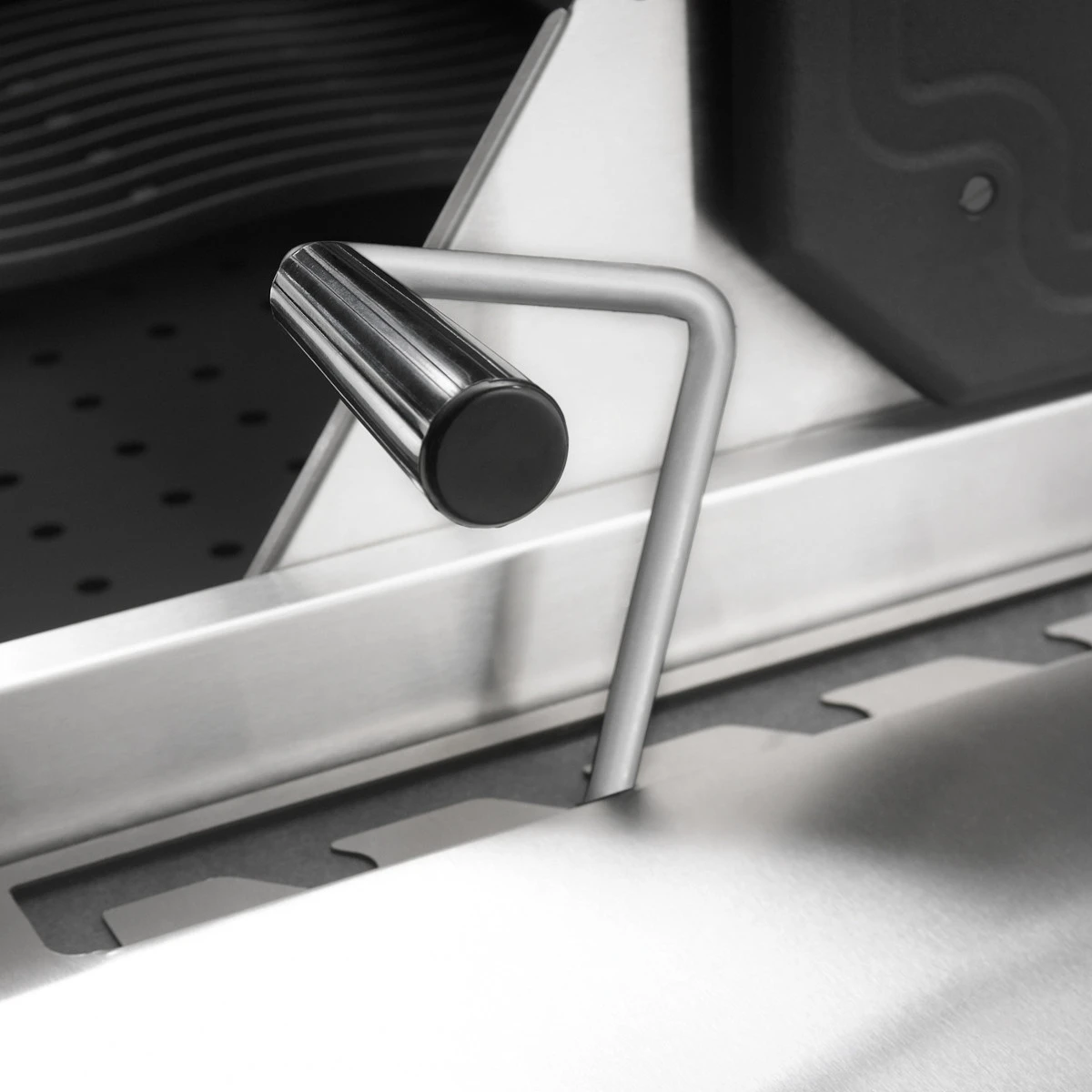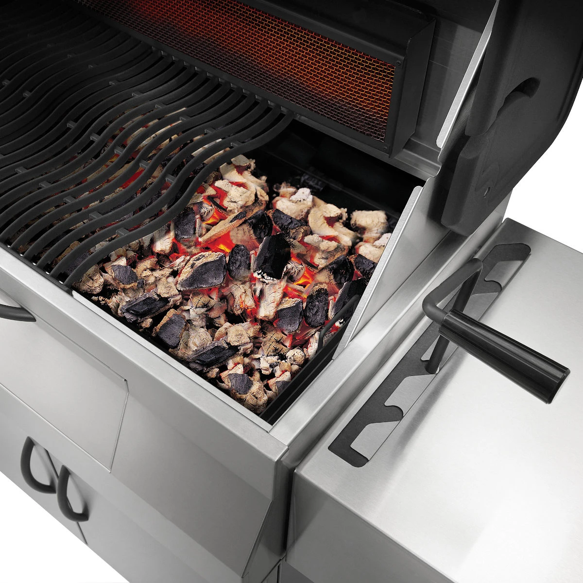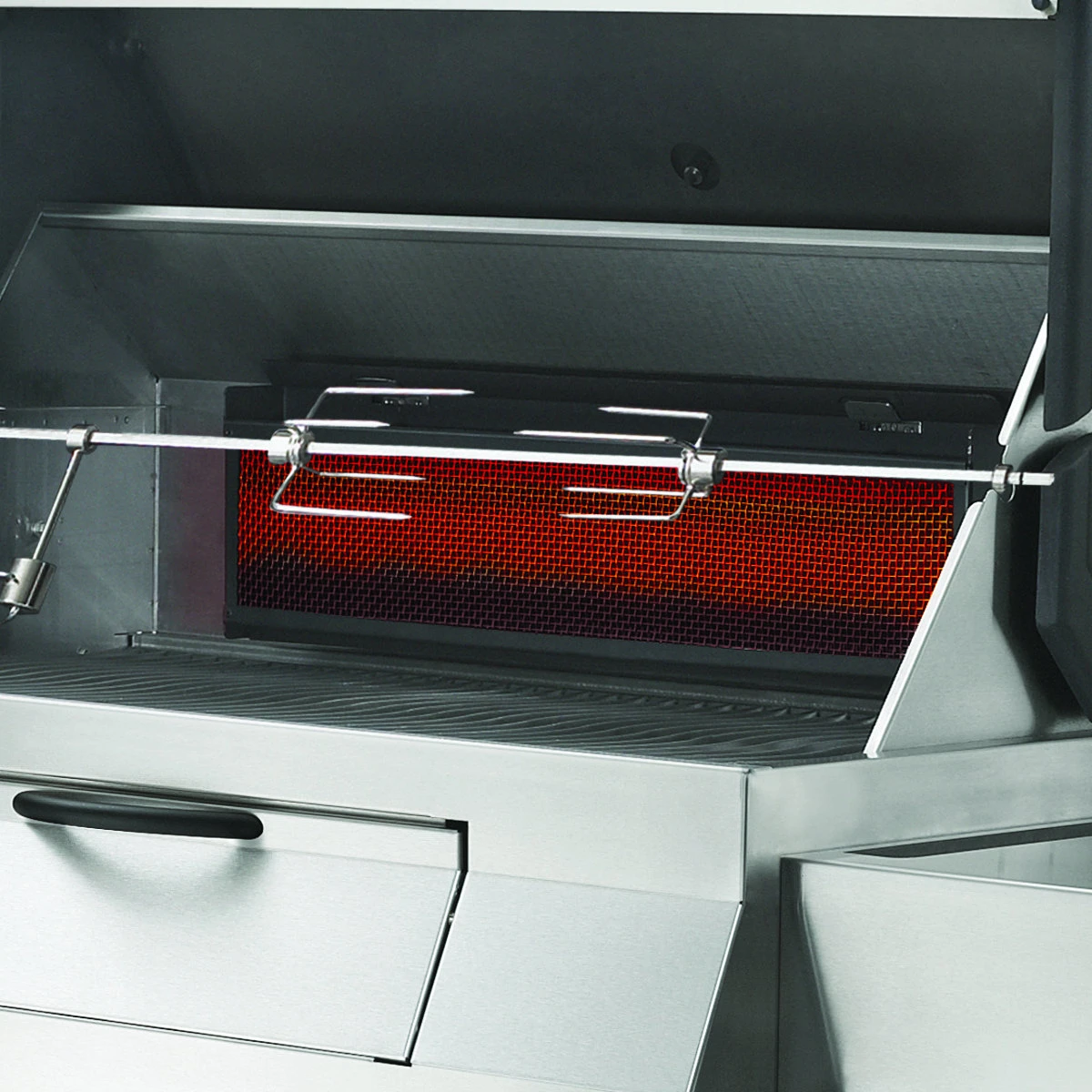 Für die perfekte Hitze unter der platzsparenden LIFT EASE™ Rollhaube inklusive präzisem ACCU PROBE™ Thermometer sorgen eine dreiteilige, höhenverstellbare Kohlewanne und ein Heckbrenner für saftige Gerichte vom Drehspieß.