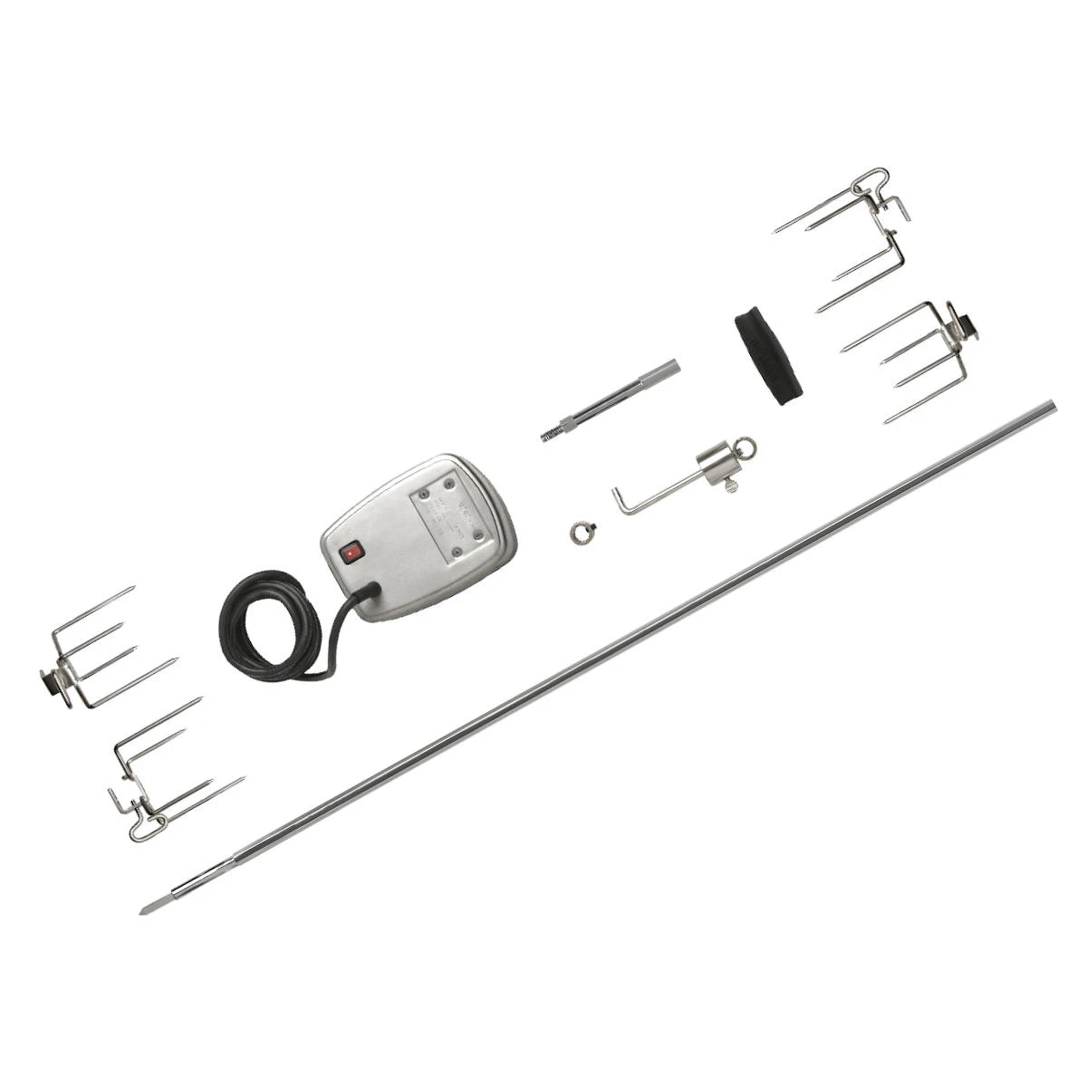 - Das Set besteht aus: Drehspieß (sechskantig), Motorhalterung, Muttern und Schrauben, 4 x Fleischklammern sowie Arretierung