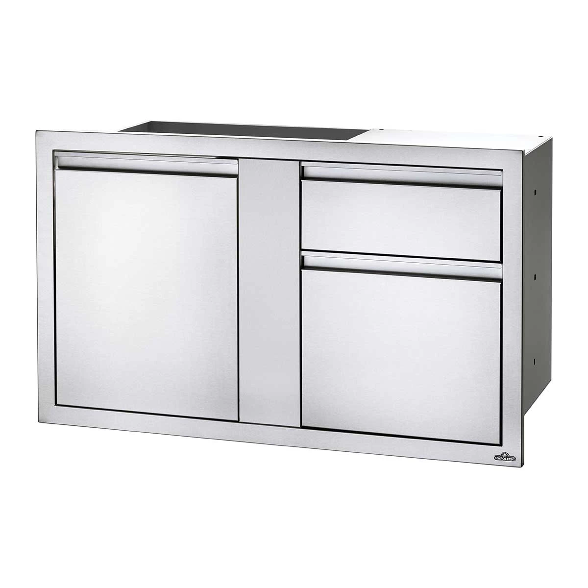 Alles untergebracht mit der Universallösung von Napoleon. Links genügend Platz für z.B. die Gasflasche, rechts eine kleine und eine Große Schublade als Staumöglichkeit für alle Grillutensilien. Die Schubladen und die Türe sind mit dem Softclose-Funktion ausgestattet.