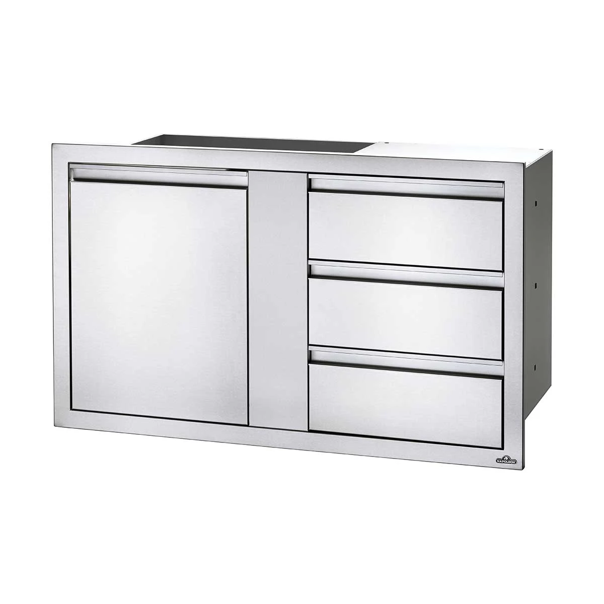 Alles untergebracht mit der Universallösung von Napoleon. Links ist genügend Platz für z.B. Eure Gasflasche, rechts befinden sich drei Schubladen zum Verstauen der meisten Grillutensilien. Die Schubladen und die Türe sind mit dem Softclose-Funktion ausgestattet.