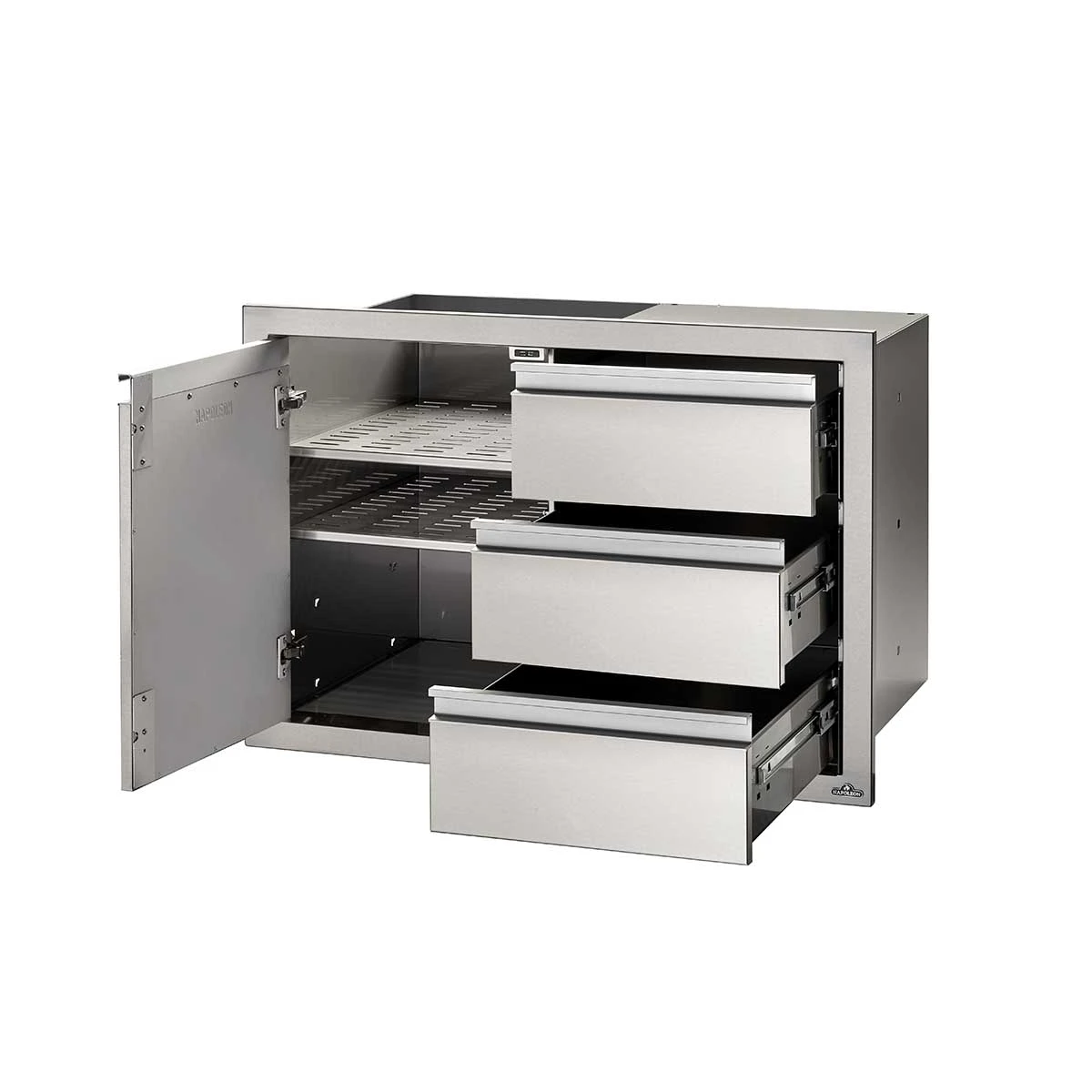 Alles untergebracht mit der Universallösung von Napoleon: Links besteht ausreichend Platz für z.B. die Gasflasche, rechts befinden sich drei Schubladen zum Verstauen von Grillutensilien.Die Schubladen und die Türe sind mit Softclose-Funktion ausgestattet.