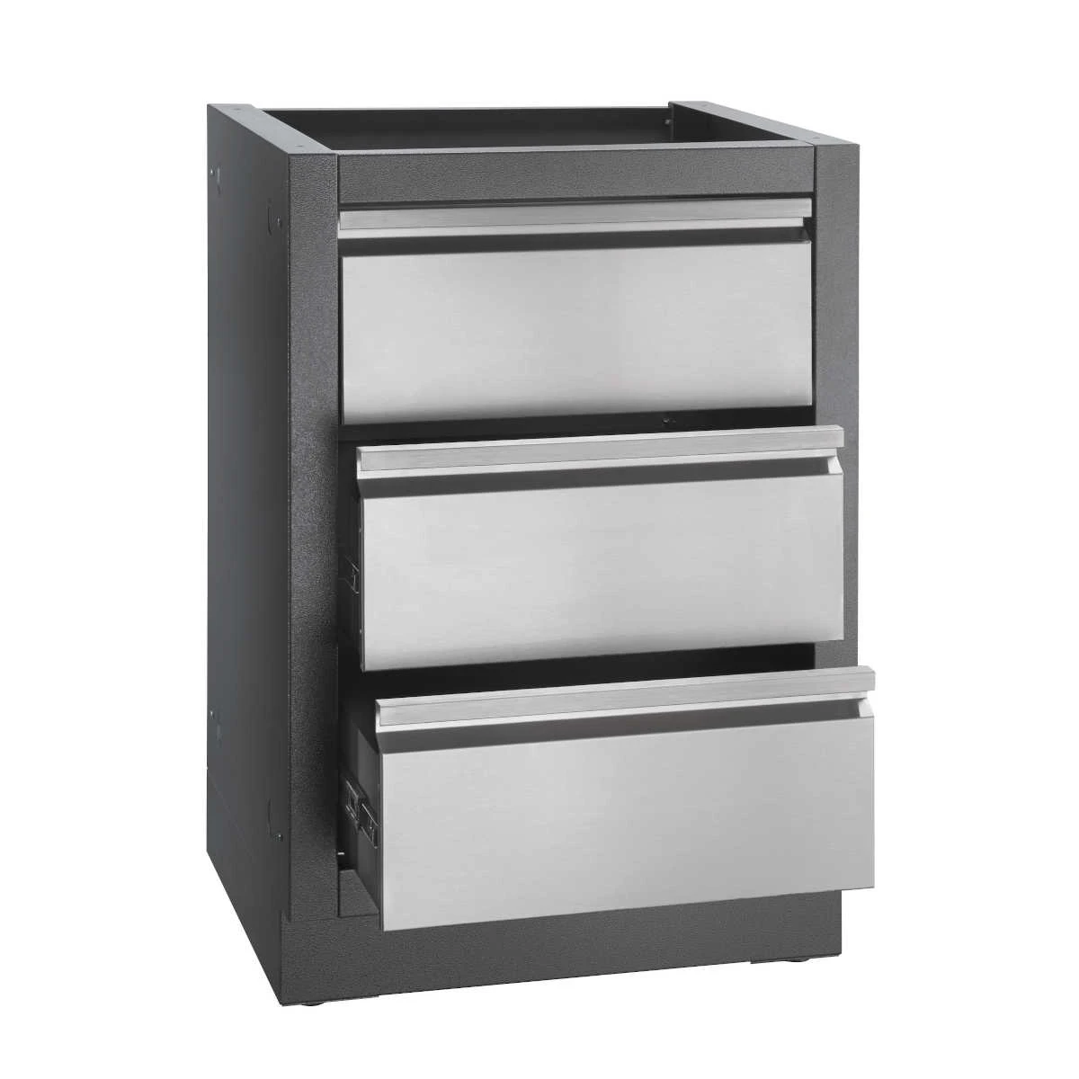 Unkompliziert und einfach im Handling, bietet der Schrank mehr als ausreichend Platz für alle wichtigen Grillutensilien. Und es passt noch mehr in die Schubladen. Für die Vorbereitung könnt Ihr einige Zutaten, Gewürze oder Accessoires fürs Smoken in den beiden Schubladen unterbringen. Und habet alles, was ein Grillfan braucht immer in Reichweite. Die oberste Schublade ist „blind“- somit für Installation einer Spüle oder eines