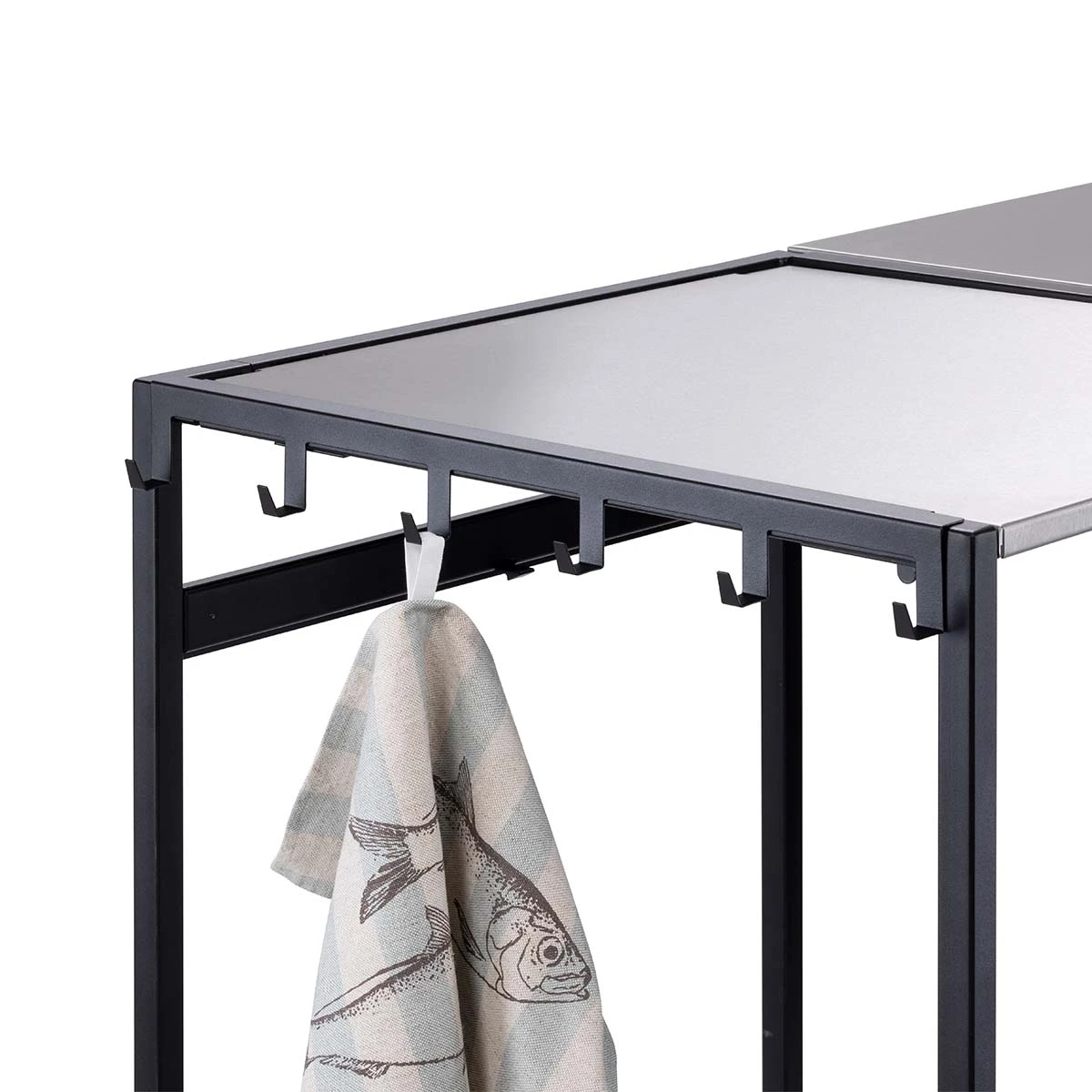 OMK ist die erste mobile Outdoor Küche, die Ihr mit nur wenigen Handgriffen werkzeuglos auf- und wieder abbauen könnt – und das ganze in nur einer Minute. Mit der passenden Hakenleiste zum Einhängen in den Beistellwagen, die dritte Ebene oder die Garage könnt Ihr Eure One Minute Kitchen im Handumdrehen erweitern. Mit der Hakenleiste mit fünf Haken zum Aufhängen habt Ihr Geschirrtuch, Grillzange und Grillbesteck immer direkt zur Hand. Die Leiste ist aus verzinktem Stahlblech und schwarz pulverschichtet – Made in Germany.