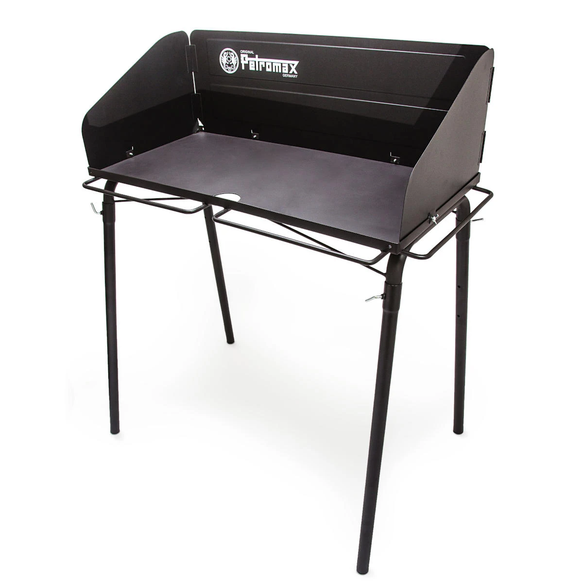 Mit einer Arbeitshöhe von 87cm kocht Ihr in angenehmer Höhe mit einem oder mehreren Feuertöpfen, je nach Größe. Die maximale Flächenbelastung beträgt 100kg. Der großzügige Windschutz garantiert auch im Freien Energie- und Kohleeffizienz. Die Tischbeine können auch abmontiert und der Tisch auf einen hitzeresistenten Untergrund gestellt werden. Grillzubehör findet an den seitlichen Bügeln seinen Platz. Eine Aussparung im vorderen Bereich des Tisches hilft Euch Kohlereste und Asche auszufegen.