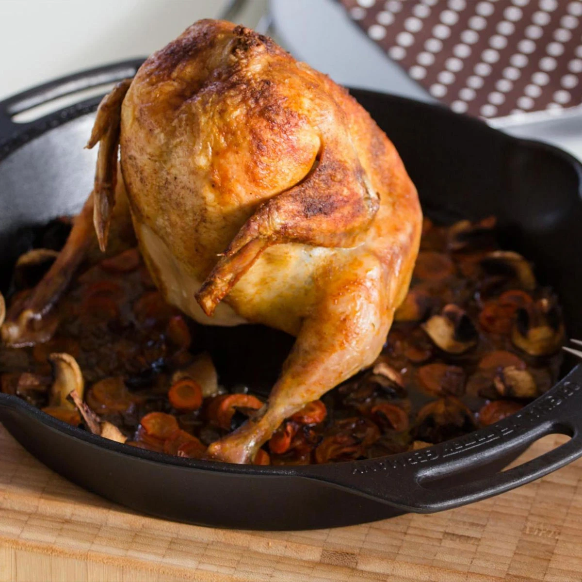 - Hähnchen, Wachtel oder eine kleine Ente werden standsicher auf , so dass das Geflügel gleichmäßig saftig und rundum kross gegart wird.