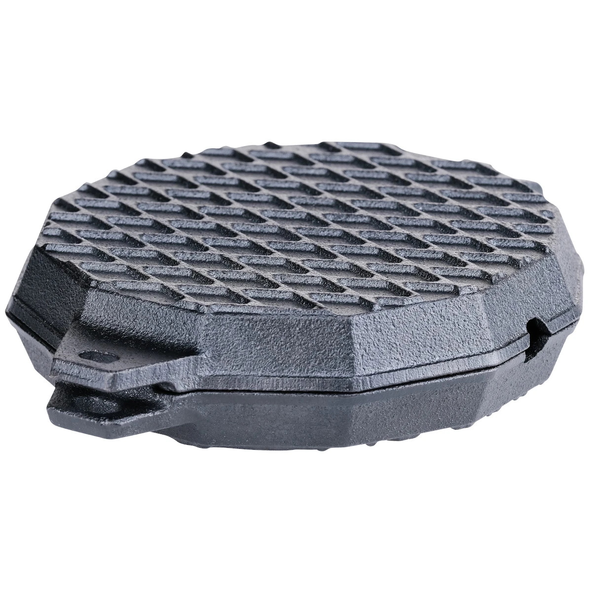 Das Burgereisen besteht im Wesentlichen aus zwei gusseisernen Grillpfannen, die ein Scharnier miteinander verbindet. In der einen Hälfte befindet sich eine Grillplatte und in der anderen Spikes.