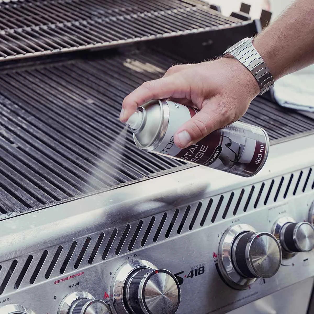 Das Spray in den Innenraum des Grills / auf das Edelstahl-Grillrost sprühen.
