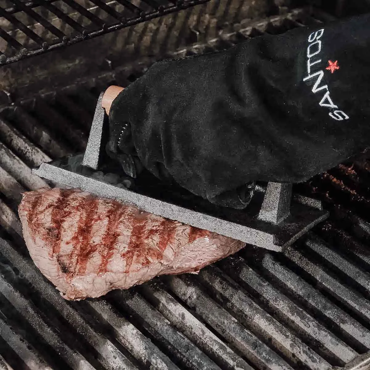 Die SANTOS Fleischpresse sollte für Steaks nicht wortwörtlich verwendet werden – durch starkes pressen läuft der Fleischsaft auf dem Fleisch heraus und wird trocken. Alleine durch das Gewicht der Fleischpresse, wird das Fleisch in Form gehalten. Zusätzlich verringert sich die Garzeit durch die größere Auflagefläche.