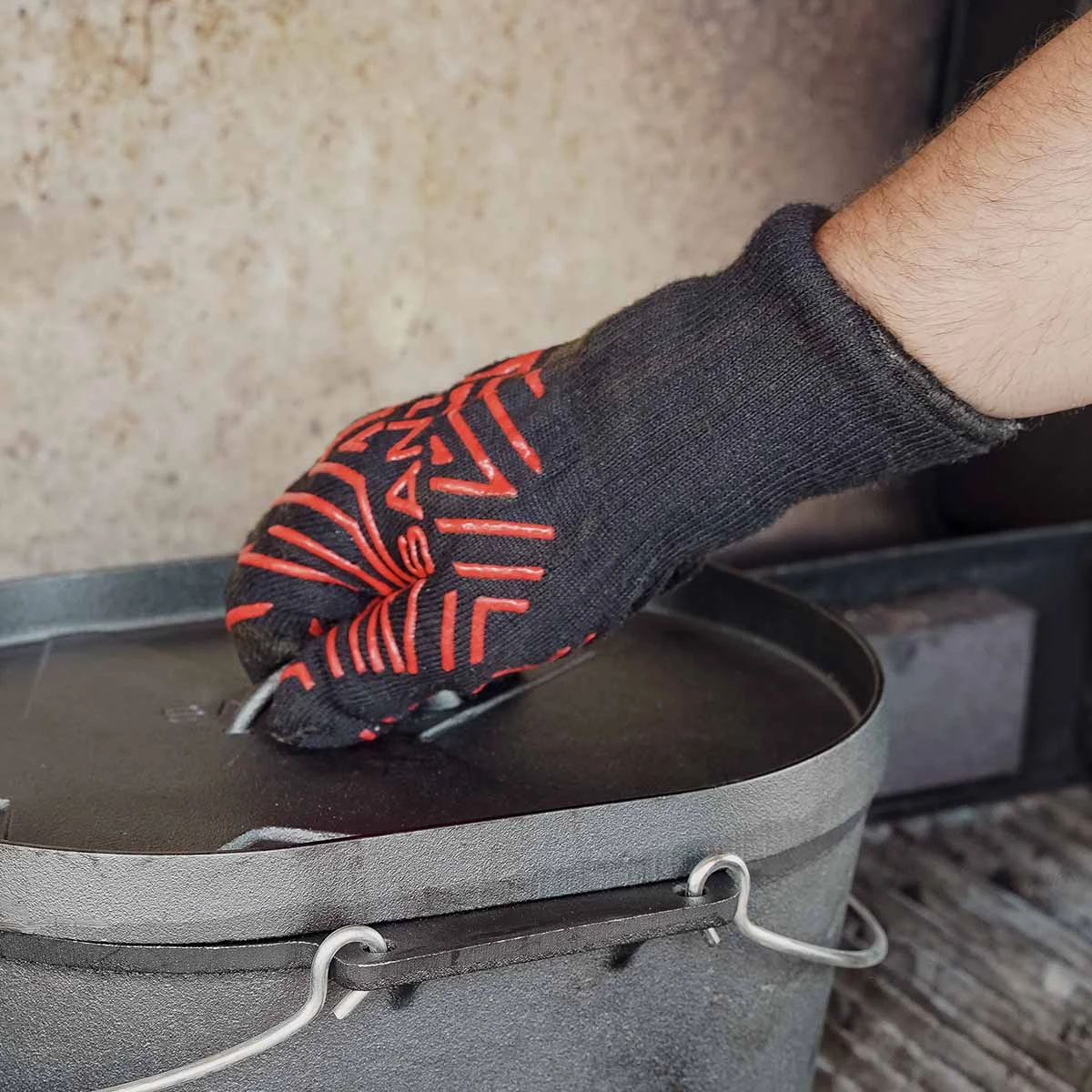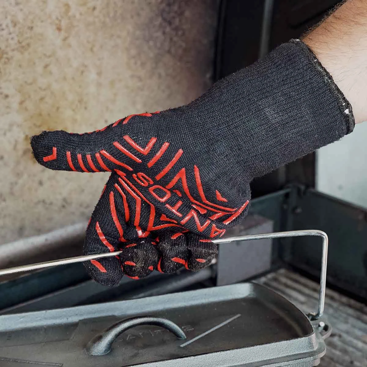Der SANTOS Grillhandschuh aus feuerfesten Aramid-Fasern schützt Eure Hände und einen großen Teil der Unterarme effektiv vor Hitze, Funken und Verbrennungen. Das flexible Material ermöglicht leichtes An- und Ausziehen und komfortables Arbeiten am heißen Grill oder Ofen. Die Antirutsch-Beschichtung sorgt für einen sicheren Grip bei Grillrost und Grillzubehör. Der Grillhandschuh schützt zuverlässig vor Temperaturen bis 250°C, kurzzeitig bis zu einer Kontakthitze von 500°C.
