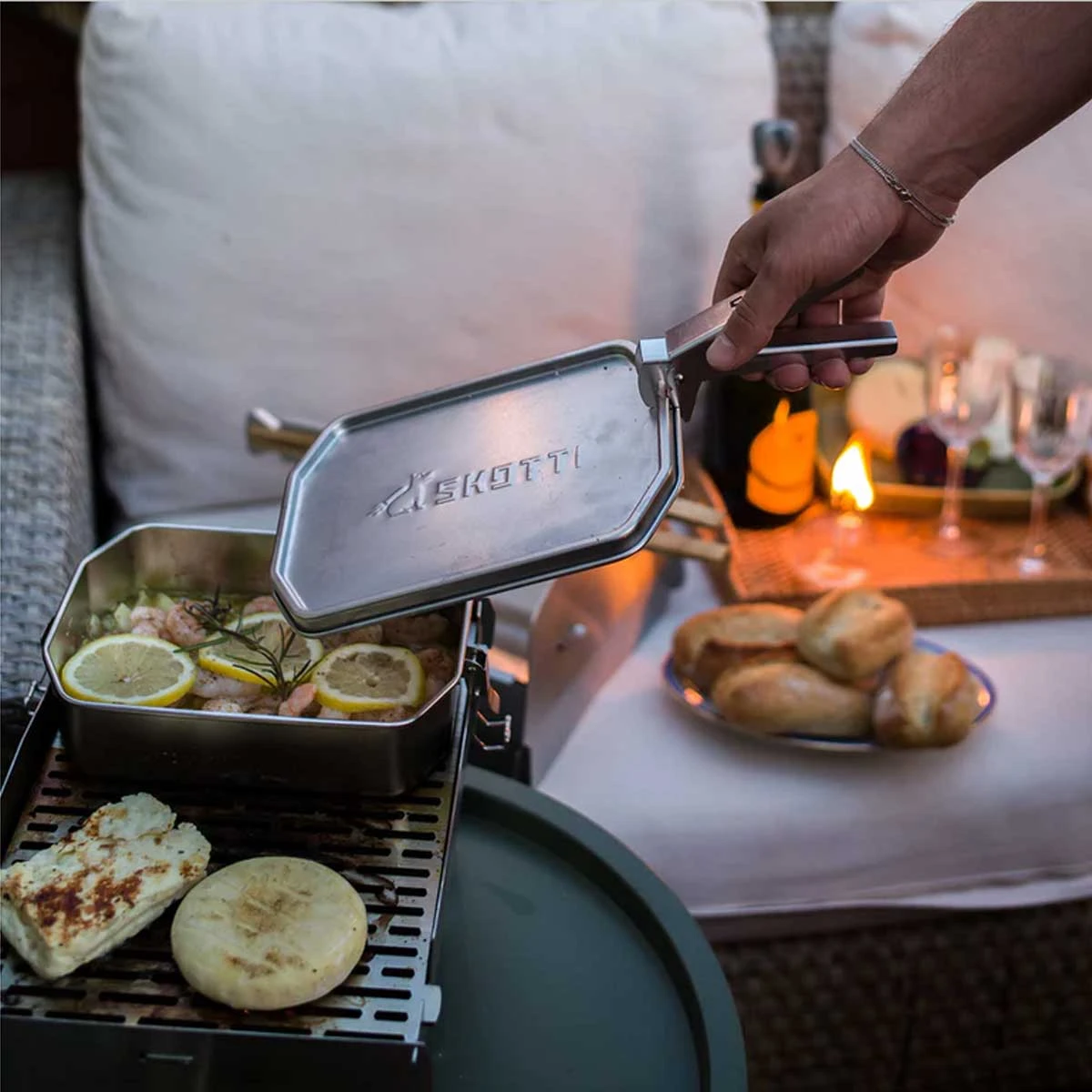 Mit der Skotti Boks verwandelt Ihr Euren Skotti Grill in eine kleine Outdoorküche zum Grillen, Kochen, Braten und Schmoren. Die robuste Edelstahldose mit dem dicht schließendem Deckel und einem praktischen Greifer aus Aluminium kann äußerst vielseitig verwendet werden und ist ein geniale Erweiterung für Euren Skotti Grill.